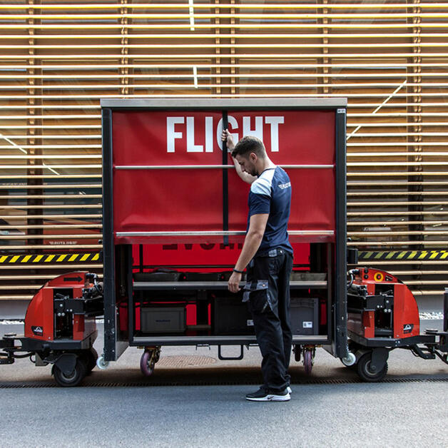 In addition, the load train is equipped for year-round outdoor operation, which is indispensable for the production processes in various assembly halls: lighting system, pendulum axle with spring system as well as the weatherproof load carriers enables the use on the entire Pilatus factory premises and outdoor journeys between the individual assembly halls.
